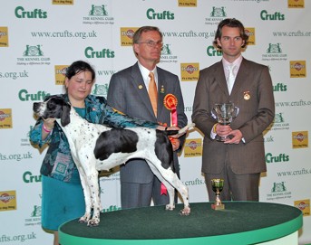 Marion Stiphout representing the Netherlands, Weimaraner. Judge Christopher Habig. Runner-up was Jane Cryer (UK). |